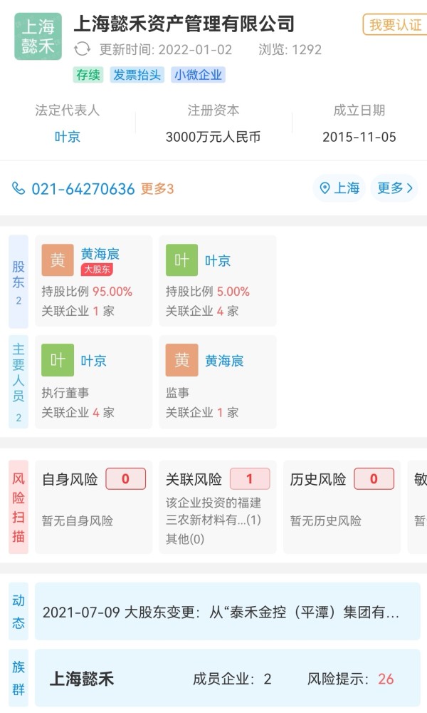福建三农新材料公司只有一个控股100%的大股东即上海懿禾资产管理有限公司,上海懿禾有两个股东,一个是大股东黄海宸占95%股份,另外一个股东是小股东叶京占5%股份。