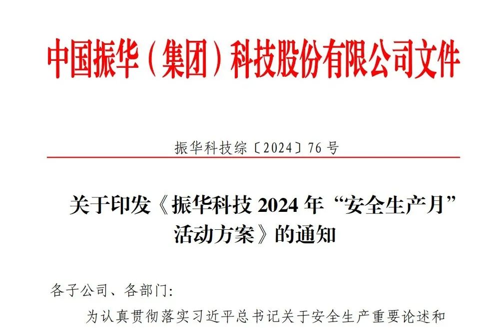 6月4日,制定印发《振华科技2024年“安全生产月”活动方案》,指导各子公司结合实际成立活动领导小组、开展启动仪式,参与人数2176人。