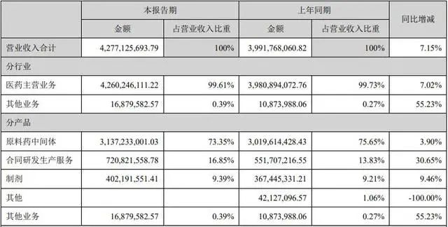 原料药中间体业务上半年营收31.37亿元,占总营收比例73.35%。不过原料药业务整体营收规模与去年持平,增速仅3.9%。