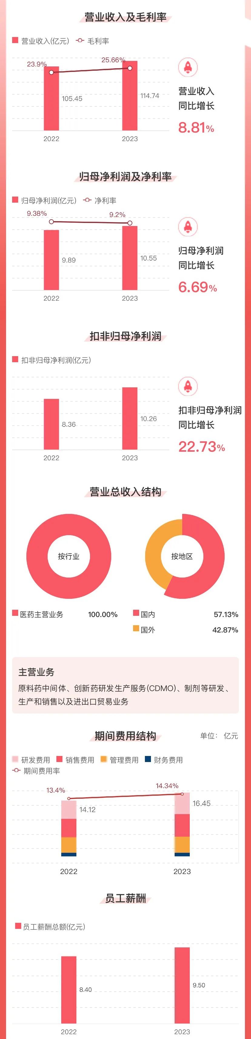 3月7日晚间,普洛药业(000739.SZ)发布2023年年度报告。公司实现营业收入114.74亿元,同比增长8.81%;归属于上市公司股东的净利润10.55亿元,同比增长6.69%;扣非净利润10.26亿元,同比增长22.73%;研发费用6.25亿元,同比增长17.25%,占营业收入5.45%;营收、净利润和研发费用实现六年连续增长,且均续创历史新高。