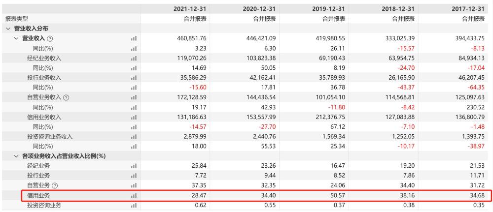 不过,虽然国海证券财富管理板块成绩亮眼,但在“拿手活”上似乎出现了某种“反转”。2017年-2020年财报显示,信用业务一直是国海证券营收中占比最高的业务。2019年,信用业务对国海证券总营收的贡献比高达50.57%,但此后则逐步下降,2021年仅占比28.47%,为5年来最低。