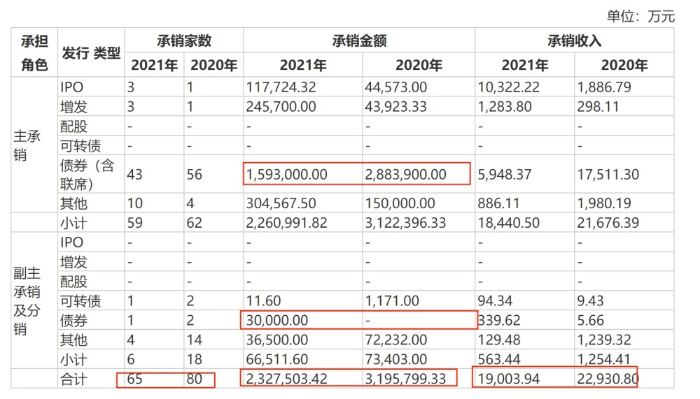 企业金融服务业务方面表现为,2021年在承销家数、金额、收入三方面都较上年有所下降。其中,债券发行承销变动最为明显,融资规模和收入相比上年减少了126.09亿元和1.12亿元。