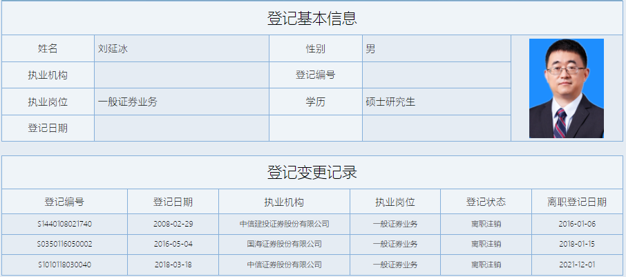 经历颇为类似的刘延冰,自2008年2月至2016年1月任职于中信建投;2016年5月至2018年1月任职于国海证券。2018年3月起任职于中信证券,同样在2021年12月离职注销。