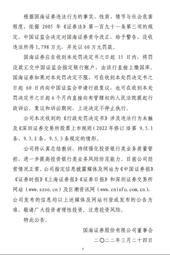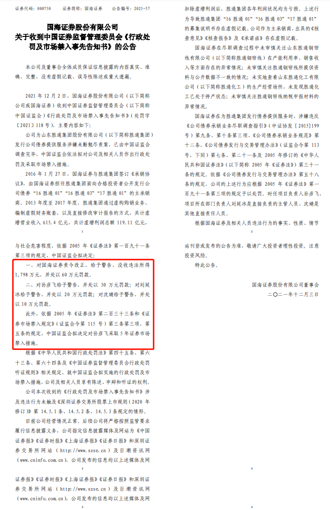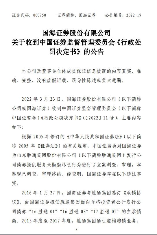 3月23日,国海证券收到了证监会〔2022〕11号《行政处罚决定书》。因担任胜通债主承销商未勤勉尽责,证监会对国海证券予以监管警示,罚没违法所得1,798万元,另处60万元罚款。