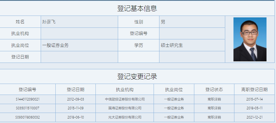 中证协信息显示,孙彦飞自2012年9月至2015年7月任职于中信建投;2015年11月至2018年5月任职于国海证券;2018年6月起,他任职于光大证券,2021年12月,在收到前述告知书之后,离职注销。