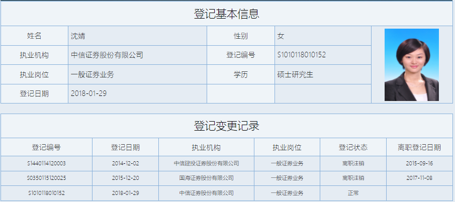 沈婧女士资历相对较浅,但也是顶级投行出身。她自2014年12月至2015年9月任职于中信建投;同年12月加入国海证券,2017年11月离职;2018年1月,她入职中信证券,目前未见变动。