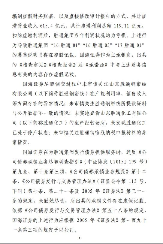 证监会指出,国海证券在为胜通集团发行债券提供服务时,违反《公司债券承销业务尽职调查指引》《公司债券承销业务规范》《公司债券发行与交易管理办法》及2005年《证券法》的相关规定。并依据2005年《证券法》,对国海证券责令改正,给予警告,没收违法所得1,798万元,并处以60万元罚款。
