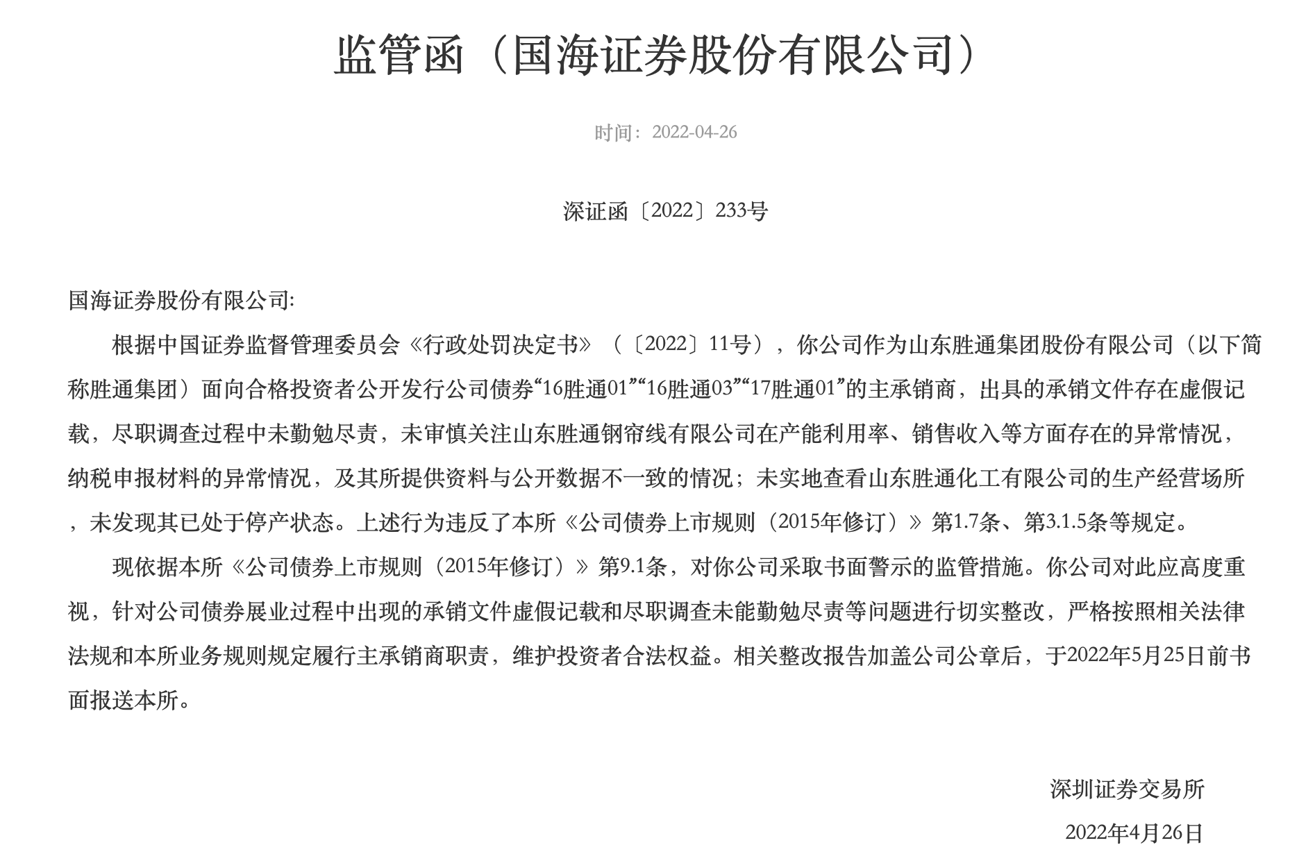 据悉,2016年1月27日,国海证券与山东胜通集团股份有限公司(下称“山东胜通”)签订《承销协议》,由国海证券担任山东胜通发行多笔债券的主承销商。在这之中,山东胜通存在财务虚假的情况,导致债券募集说明书存在虚假记载。