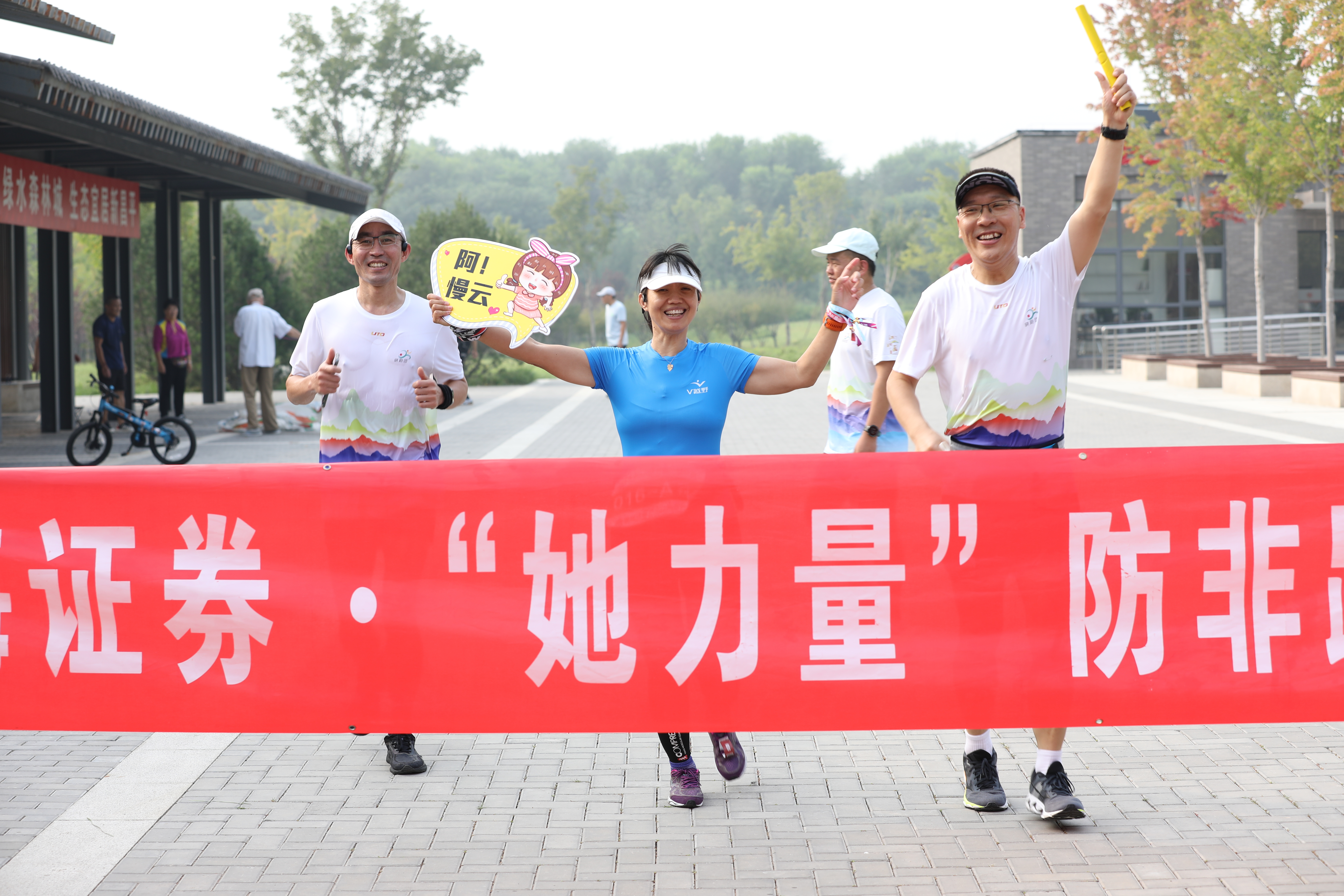 国海证券员工、有跑步爱好的客户通过线上组队的方式,每队3人,一共组成22个队伍,赛程为混合接力半程马拉松。9月中旬的北京,秋风送爽。早晨6时起,队伍根据安排的比赛时间,错峰陆续来到北京东小口城市休闲公园北门,国海证券北京第一分公司总经理徐庆勇为本次比赛吹哨开赛。各位队员在跑道上驰骋着,努力向前,在奔跑交接的过程中,队员们还不忘高喊本次活动的口号“拒绝高利诱惑,远离非法集资”“珍惜一生血汗,远离非法集资”“天上不会掉馅饼,一夜暴富是陷阱”向着目标,向着终点冲去。参赛的队员纷纷表示:参加防非跑具有双重意义,既能强身健体,舒缓身心,还能学习防非知识,预防参与到非法集资当中,以后金融投资方面能够更加理性。