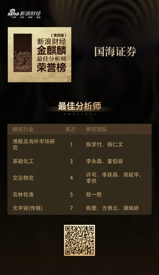 国海证券获得最佳分析师的有:港股及海外市场研究陈梦竹团队第1名、基础化工行业李永磊团队第3名、交运物流行业许可团队第4名、农林牧渔行业程一胜团队第5名、元宇宙(传媒)行业姚蕾团队第7名。