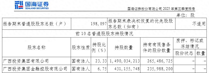 股权方面,国海证券2025年第三季度报告显示,截至报告期末,公司持股比例5%以上的股东共有2家,分别为广西投资集团有限公司、广西投资集团金融控股有限公司,持股比例分别为23.33%和6.75%。