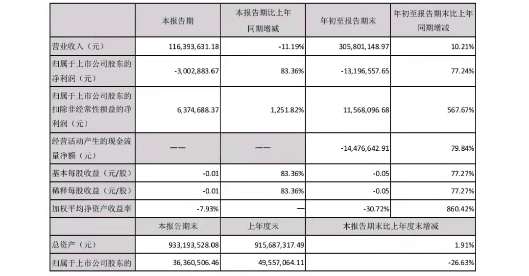 其中,2021年第三季度,*ST西发营业收入为1.16亿元,同比下降11.19%;归属于上市公司股东的净亏损为300.29万元。