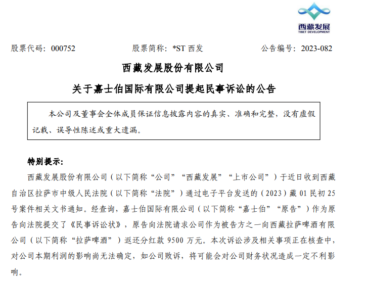 *ST西发9月4日公告,公司于近日收到法院通过电子平台发送的(2023)藏01民初25号案件相关文书通知。嘉士伯作为原告向法院提交了《民事诉讼状》,原告向法院请求公司作为被告方之一向拉萨啤酒返还分红款9500万元。本次诉讼涉及相关事项正在核查中,对公司本期利润的影响尚无法确定。