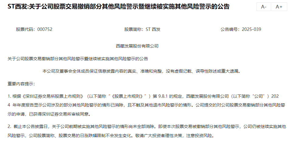 近日,ST西发公告称,公司2024年年度报告显示公司涉及的部分其他风险警示情形已消除,且不触及退市风险警示。公司提交的对公司股票交易撤销部分其他风险警示的申请,已获得深圳证券交易所审核同意。