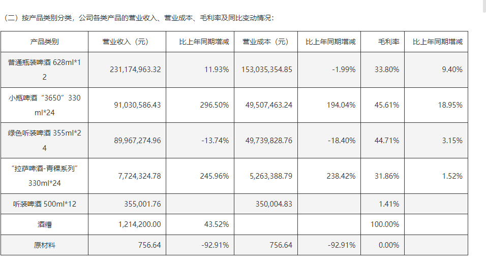 数据显示,2024年公司品牌“拉萨啤酒”实现啤酒销量7.24万吨,同比增长10.94%。其中,从产品类别来看,“普通瓶装啤酒 628ml*12”2024年营收2.31亿元,撑起了公司营收的“半壁江山”;而营收增速最快的则是“小瓶啤酒‘3650 ’330ml*24”,实现营收9103.06万元,同比增长296.5%。