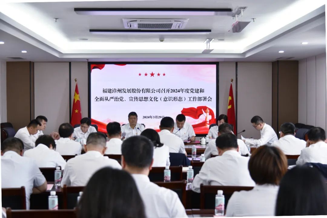 3月29日,漳州发展召开2024年度党建和全面从严治党、宣传思想文化(意识形态)工作部署会议。公司党委书记、董事长赖小强主持会议并作工作部署。公司领导班子成员,各党(总)支部书记,总经理助理,各板块、各部门负责人参加会议。