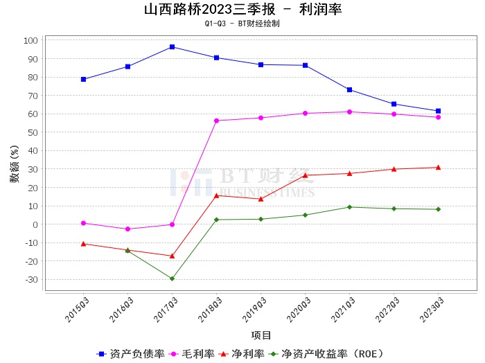 根据山西路桥2023年三季度财报,公司资产总计为1.28百亿元,较上年度末的1.27百亿元略有增长。负债合计为78.8亿元,相比上年度末的81.86亿元有所下降。这表明公司在资产管理上有所改善,负债规模得到控制。