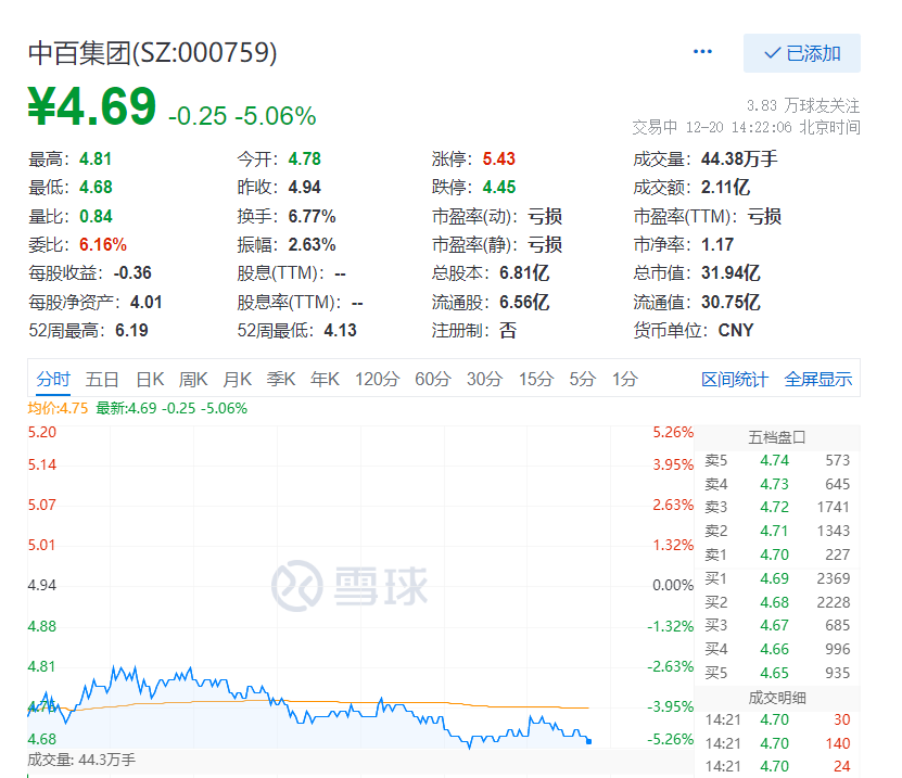 乐居财经李兰 12月20日,截至14:22,中百集团(000759.SZ)股价跌5.06%,报4.69元,总市值为31.94亿元。
