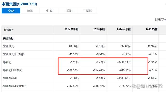 之后,中百集团的业绩反复波动。但到2019年其遭遇了历史上首次净利润亏损。之后一发不可收拾,从2021年开始,中百集团的净利润连续亏损,三年累计亏损超7亿元。截至2024年三季度,中百集团营收81.3亿元,同比下跌11.5%;净利润再次亏损3.32亿元,同比大跌309.35%。