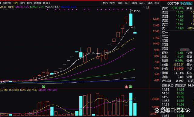 而就在新年的第一个交易日,其还强势涨停。中百集团的股价从12月2日一根涨停板开始,拉开了其这轮行情。彼时,其股价仅仅4元左右。随后,其在24个交易日中共拉出了15个涨停板。截至元月3日,其股价最高已摸至15.56元,涨幅近3倍。