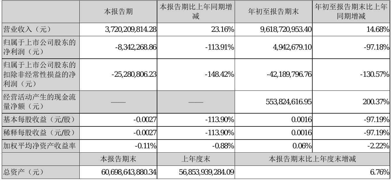 挖贝网10月26日,晋控电力(000767)近日发布2021年前三季度报告,报告期内营业收入9,618,720,953.40元,同比增加14.68%;净利4,942,679.10元,同比净利减少97.18%。