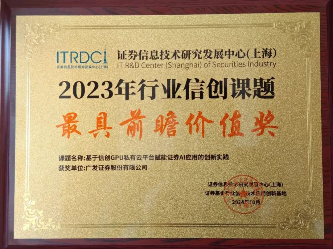 近日,“证券基金行业信息技术应用创新联盟”(简称信创联盟)2024年度工作总结会议中,ITRDC[证券信息技术研究发展中心(上海)] 2023年度行业信创课题获奖情况正式揭晓。广发证券信息技术部云平台团队的《基于信创GPU私有云平台赋能证券AI应用的创新实践》课题,凭借其创新性和前瞻性,荣获最具前瞻价值奖。