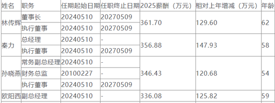 董事长林传辉税前报酬总额361.7万元,较2024年增长129.60万元,涨幅55.84%;总经理秦力356.88万元,增长147.93万元,涨幅70.80%;副总经理欧阳西336.08万元,增长115.63万元,涨幅56.35%;副总经理胡金泉从74.71万元暴涨至314.72万元,涨幅高达321.26%,堪称“涨薪王”。