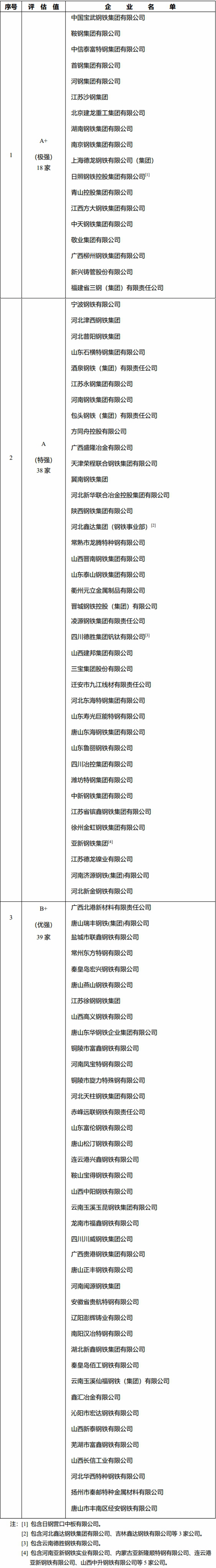 报告指出,今年进入评级A+、A、B+的钢铁企业共有95家,占评估钢铁企业总家数的88.7%,合计粗钢产量占全国总产量的93.0%,其中: