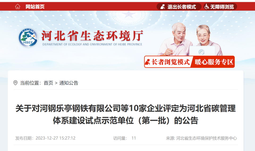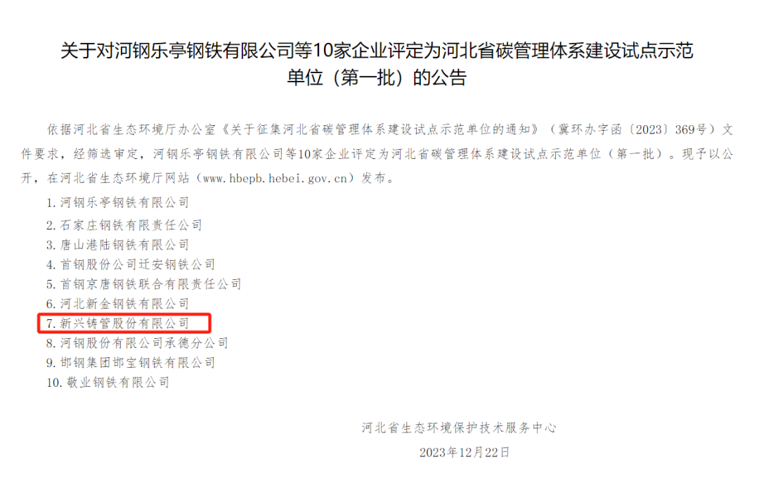 近日,河北省生态环境厅发布碳管理体系建设试点示范单位(第一批)企业名单,新兴铸管股份有限公司入选。这是对新兴铸管碳管理工作的充分肯定,彰显出公司在碳管理体系建设方面取得了突出成绩。