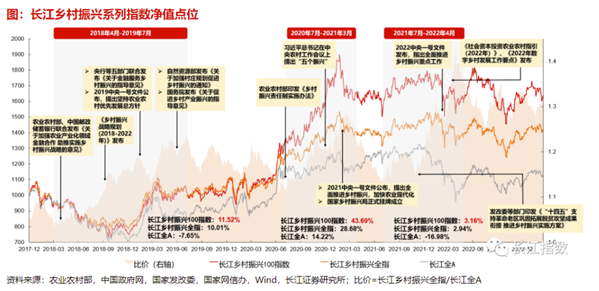值得关注的是,投资表现方面,自基期2017年12月至2023年3月17日,长江乡村振兴系列指数均大幅跑赢长江全A。且系列指数主题行情与政策信号存在一定程度的共振和传导,在利好政策密集发布的阶段,两只指数相对长江全A均有亮眼表现。