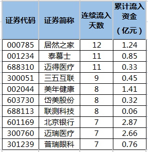 数据宝统计,截至7月17日收盘,沪深两市共有50只个股连续5日或5日以上主力资金净流入。连续流入天数最多的是居然之家,已连续12个交易日净流入;连续净流入天数较多的还有泰慕士、迈得医疗、三五互联、美年健康、岱美股份,分别获获11个、11个、9个、8个、8个交易日净流入。