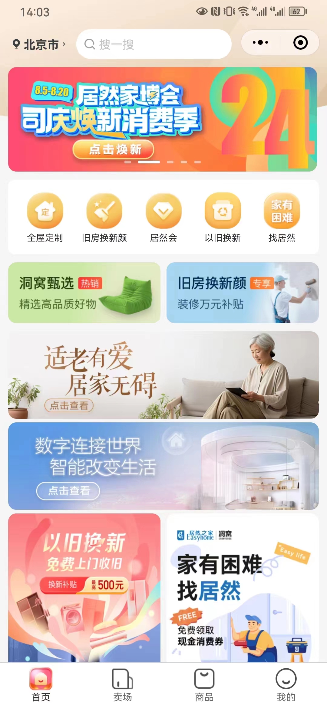 居然之家24周年司庆营销活动正式启动,响应国家促进家居消费政策的号召,居然之家全国428家门店全部参加,并继续夯实三大营销IP活动,在全国范围内推出家具家电以旧换新,消费者可通过“洞窝”平台参加“以旧换新”活动,最高可领取500元消费券;推出旧房换新颜,消费者通过“洞窝”平台选择居然乐屋装饰公司装修,可享受每平米补贴100元,最高补贴10000元待遇;推出家有困难找居然,消费者可通过“洞窝”APP和小程序“家有困难找居然”入口,报名免费领取维修服务权益券。