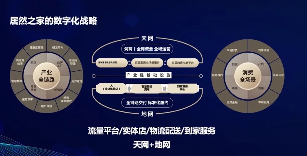 总得来说,居然之家的数字化战略就是围绕着洞窝这个流量平台、线下实体店的体验,再加上物流配送和到家服务,形成天网地网合一的S2B2C服务平台。B端是产业的供应链全链路,C端则打造了一个消费全场景,包括流量的获取、分发、转化和裂变以及再循环的数字化营销的闭环。