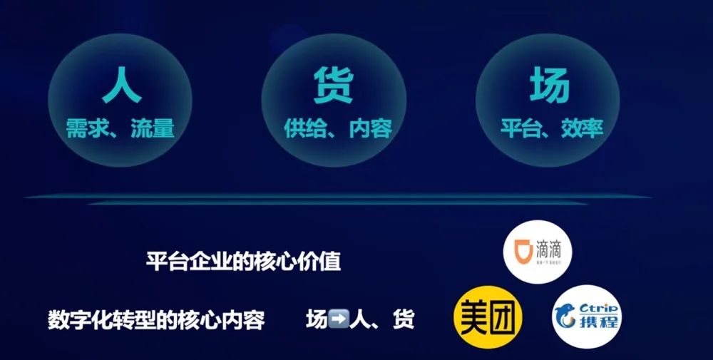 也就是说,平台企业的核心价值是能够为供需双方提升交易效率、解决交易的痛点、降低交易的成本,进而改善交易的体验。而作为“场”,平台企业数字化转型的核心内容就是要从过去仅运营“场”向运营“人”和“货”转变。