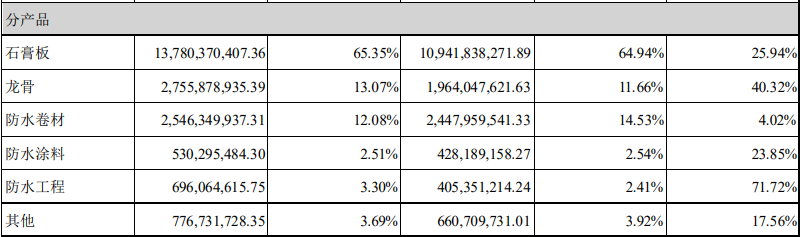 按照产品来划分,防水紧随石膏板其后。2021年,防水卷材的营收为25.46亿元,同比增加4.02%,防水涂料的营业收入为5.30亿元,同比增加23.85%,防水工程的营业收入为6.96亿元,同比增加71.72%。三者合计37.72亿元。2021年,龙骨的营收为27.56亿元,同比增加40.32%。