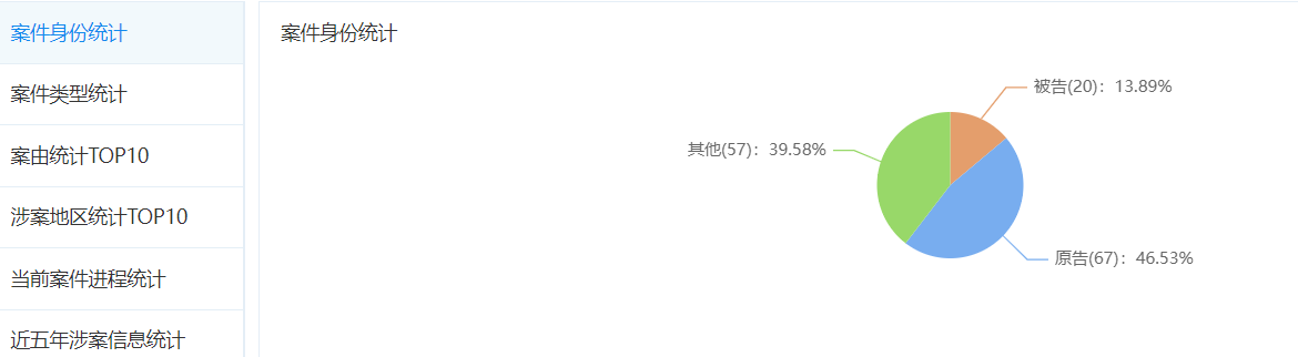 乐居财经获悉,北新建材共涉司法案件144起,作为原告的比例为13.89%,案由多以其他行政为主。此外,北新建材还有裁判文书记录157条,案件总金额为369.96万元,作为被告的文书占比35.71%,涉案案由为其他行政的案件最多。