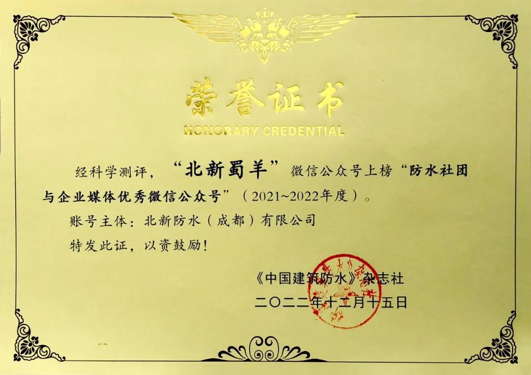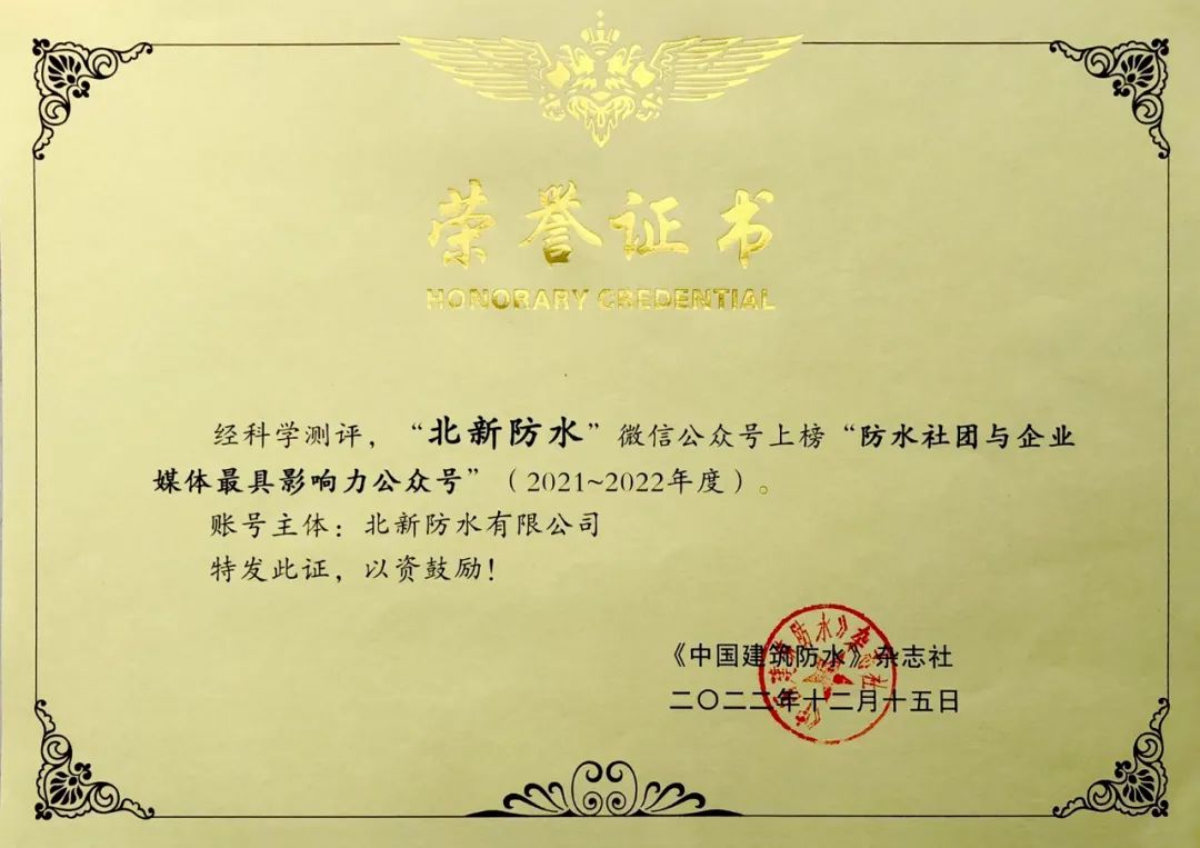 近日,《中国建筑防水》杂志社“防水社团与企业媒体最具影响力微信公众号(2021—2022年度)”等系列榜单测评结果揭晓,北新防水获评“最具影响力微信公众号(2021-2022年度)”、北新防水旗下媒体号北新蜀羊获评“优秀微信公众号(2021-2022年度)”及“优秀主编”“优秀编辑”等个人荣誉。