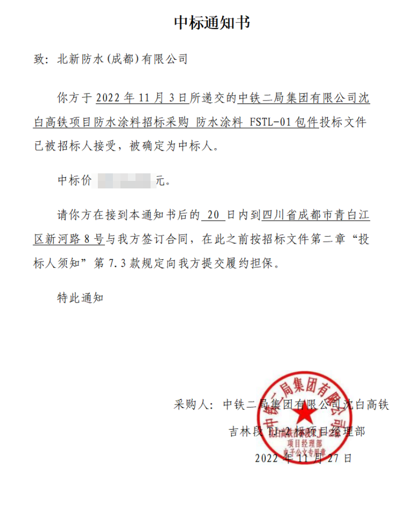 成为中铁二局--沈白高铁项目防水材料集采成交人