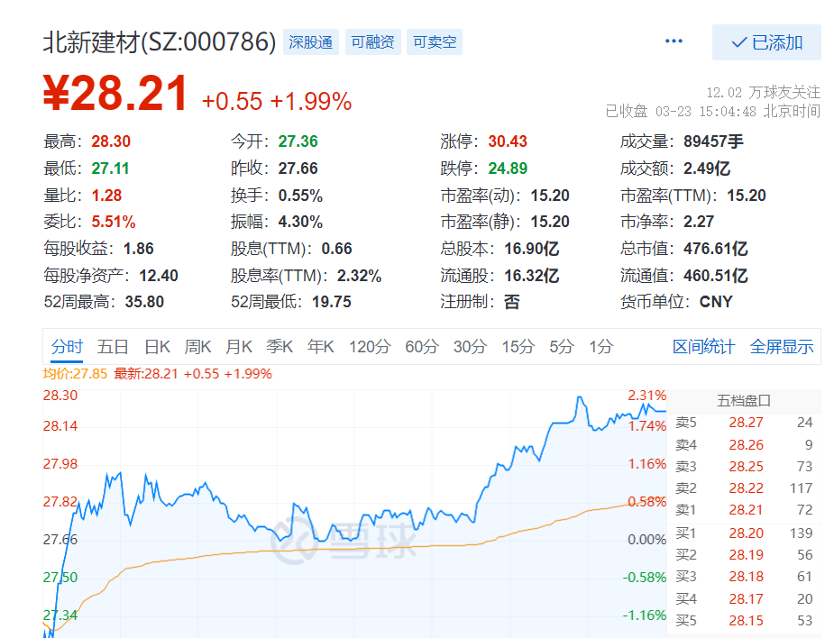 截至3月23日收盘,北新建材股价涨1.99%,报28.21元,总市值为476.61亿元。