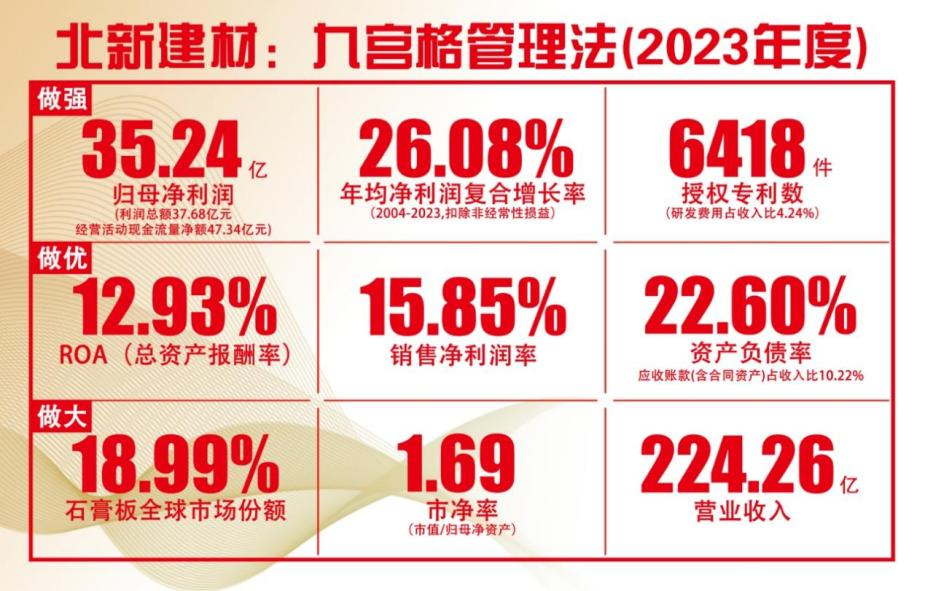 北新集团建材股份有限公司(简称北新建材)践行“绿色科技品质生活”公司使命,坚守“价本利”经营理念,打造“双增长”模型,产品扮靓天安门城楼,应用于冬奥会、大运会、亚运会等重大工程项目,服务神舟飞船等大国重器,企业核心竞争力不断提升,核心功能不断增强。近年来,公司以“一线状态”全力应对严峻复杂经营环境,坚守“价本利”经营理念,打造“双增长”模型,加快推动“四个转变”,加速向消费类建材制造服务商转型,2024年前三季度,实现收入、利润两位数“双增长”,连续19年年均净利润复合增长率超26%,品牌价值超1185亿元,交出高质量发展优异答卷。