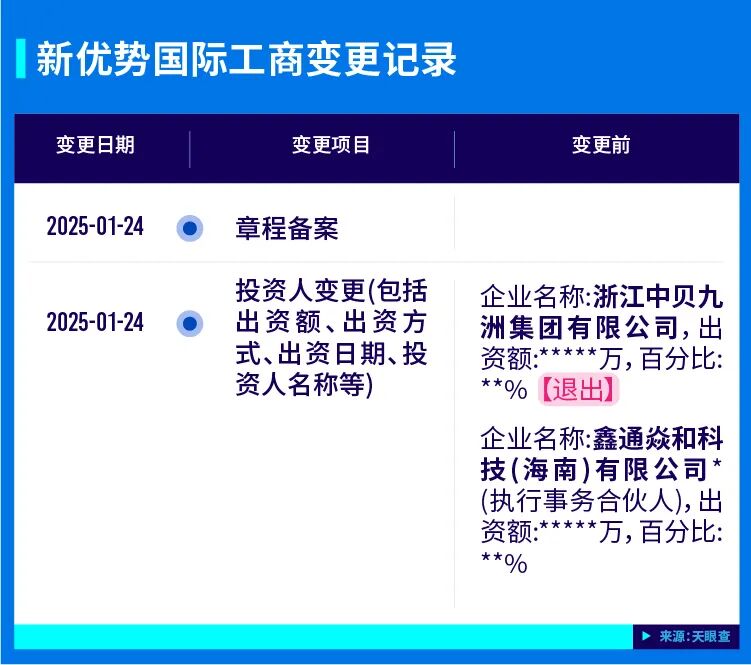 徐晰人旗下核心平台——新优势产业集团有限公司,自2016年注册资本由5000万元骤增至10亿元。其关键合作方花轩德2016年是高管,2017年成为股东,2018年时即是董事,并在2024年11月徐晰人收购合成集团前夕,将其持股转换为通过有限合伙企业间接持有。在新优势国际收购合成集团后,花轩德旗下浙江中贝九洲集团有限公司也随即退出了新优势国际。