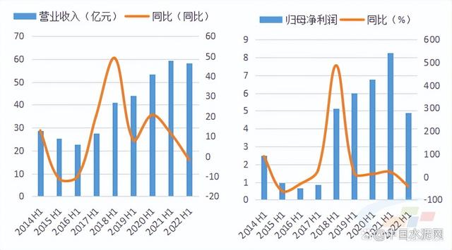 图1、2:2022年上半年万年青营业收入与归母净利润