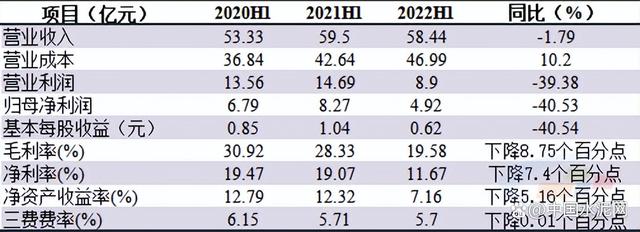 2022年一季度,公司实现营业收入27.36亿元,同比增长0.96%,而二季度营收小幅下滑,最终上半年营收同比降低1.79%,共计58.44亿元。与此同时,上半年公司营业成本同比增长10.2%,导致上半年公司利润承压,最终归母净利润同比大幅降低40.53%至4.92亿元,毛利率下降8.75个百分点。