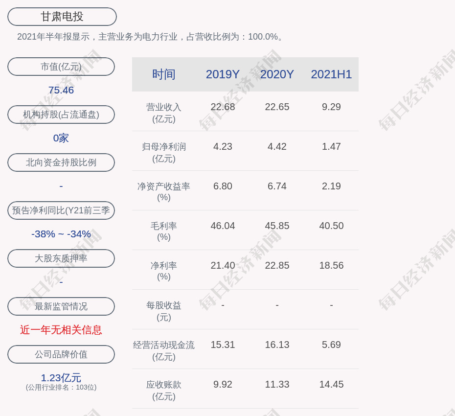 2021年半年报显示,甘肃电投的主营业务为电力行业,占营收比例为:100.0%。