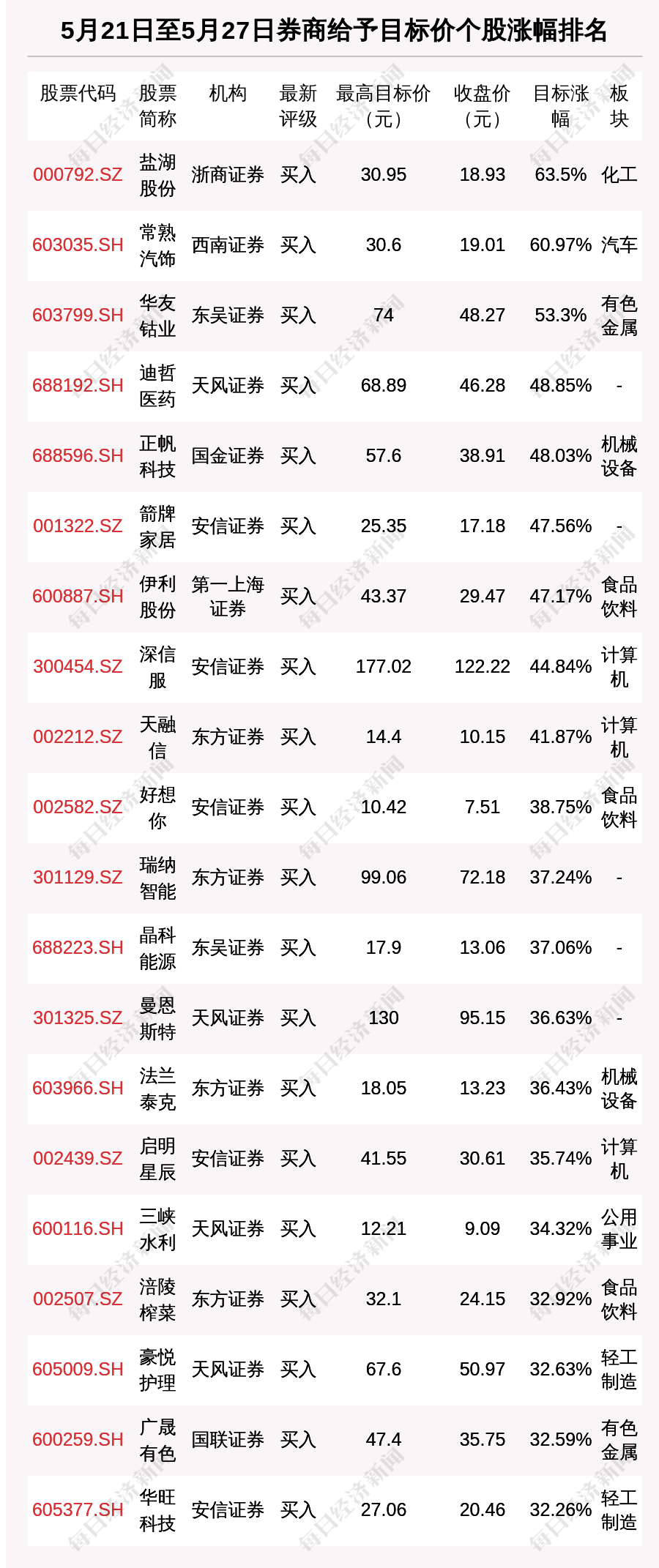 5月21日至5月27日,券商给予评级的个股数共有248只,获得买入评级的个股数共有180只。在公布了目标价格的48只个股中,按照最新收盘价计算,预期涨幅排名居前的个股是盐湖股份(000792.SZ)、常熟汽饰(603035.SH)、华友钴业(603799.SH),预期涨幅分别是63.5%、60.97%、53.3%。