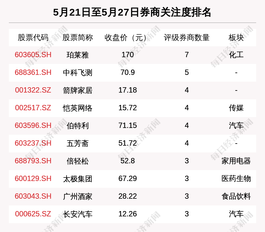 从券商对个股的关注程度来看,有38只个股获得多家券商关注,券商关注数量排名居前的个股是珀莱雅(603605.SH)、中科飞测(688361.SH)、箭牌家居(001322.SZ)。