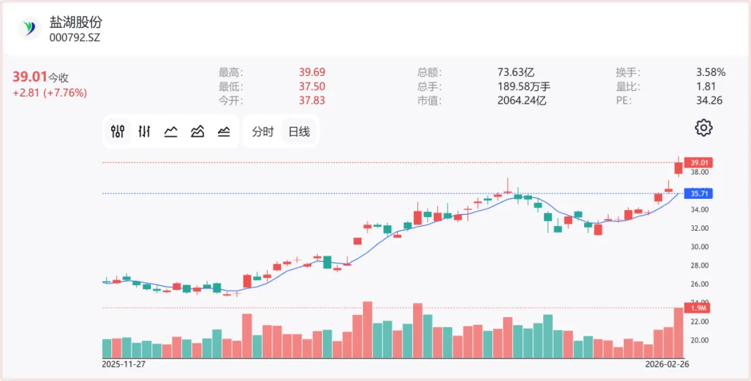多年以后,面对盐湖股份,投资者会想起它在2026年2月26日抵达2000亿市值的那个早晨。不过这一次追高人士和止盈群众擦肩而过没有“互道SB”,因为他们都急着朝自己的想象奔去。