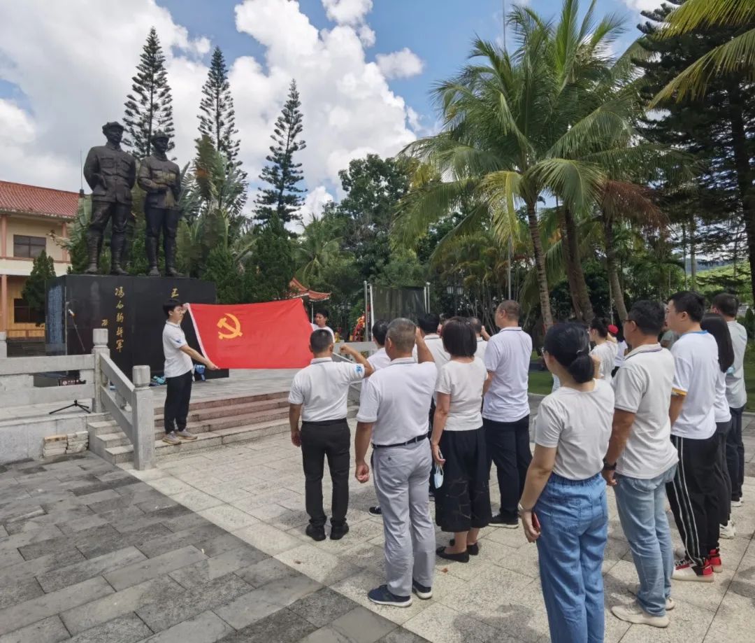 在革命先辈冯白驹将军、王文明主席雕像前,全体党员整齐列队,鞠躬默哀,缅怀革命先烈,表达最崇高的敬意。面向鲜红的中国共产党党旗,大家佩戴党徽,举起右手、握紧拳头,庄严宣誓,重温入党时的庄严承诺和坚定决心,再次接受心灵的净化和洗礼。