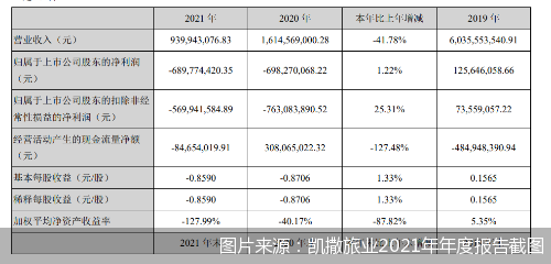 据凯撒旅业2021年财报,公司实现营业收入9.4亿元,同比减少41.78%;归属于上市公司股东的净利润亏损约6.9亿元,虽然同比上升1.22%,但净利润依然大幅亏损。凯撒旅业2020年财报还显示,其净利润亏损6.98亿元。两年累计亏损超13.88亿元。
