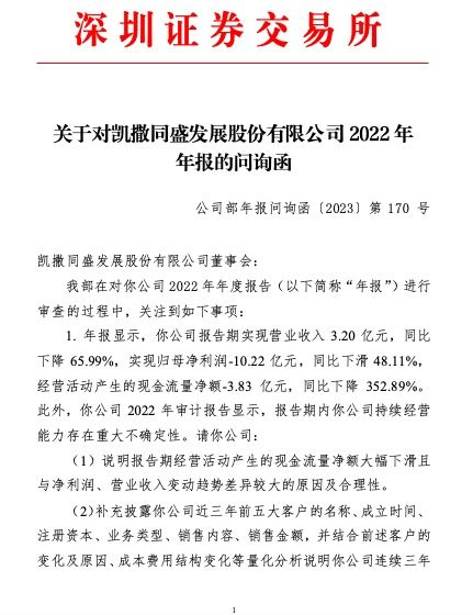 5月20日,凯撒同盛发展股份有限公司(以下简称“*ST凯撒”或“公司”)收到深圳证券交易所关于2022年年报的问询函。问询函要求*ST凯撒说明报告期经营活动产生的现金流量净额大幅下滑且与净利润、营业收入变动趋势差异较大的原因及合理性;补充披露公司近三年前五大客户的名称、成立时间、注册资本、业务类型、销售内容、销售金额,并结合前述客户的变化及原因、成本费用结构变化等量化分析说明公司连续三年大额亏损的原因,是否符合行业发展趋势,并说明公司将采取改善持续经营能力及盈利能力的具体措施;说明减值计提时点是否准确,以前年度未计提减值是否充分、合理,本期减值准备计提是否审慎、恰当,是否存在利用减值计提不当调节利润的情形等。
